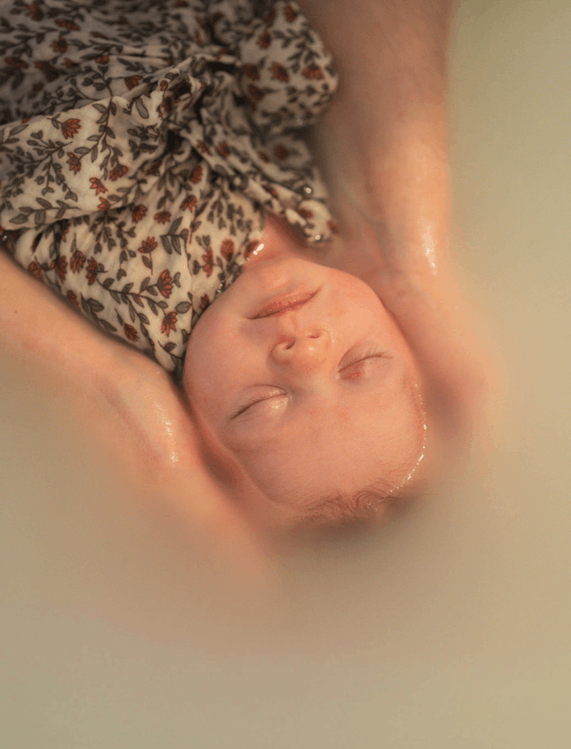 Ce bain d’accueil, enveloppe le nouveau-né dans des sensations qui prolongent celles vécues in utéro. Porté par l’eau et sa chaleur et entouré d’un lange, le bébé peut libérer, déposer ses émotions.